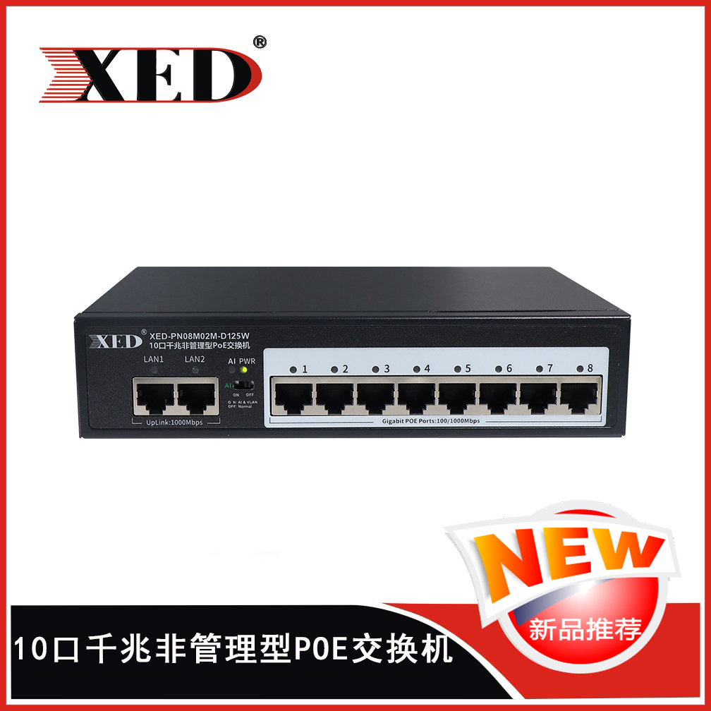 XED-PN08M02M-D125W是一款高性能的全千兆POE交換機,可通過網線為無線AP,攝像頭等PD設備提供最大單端口...